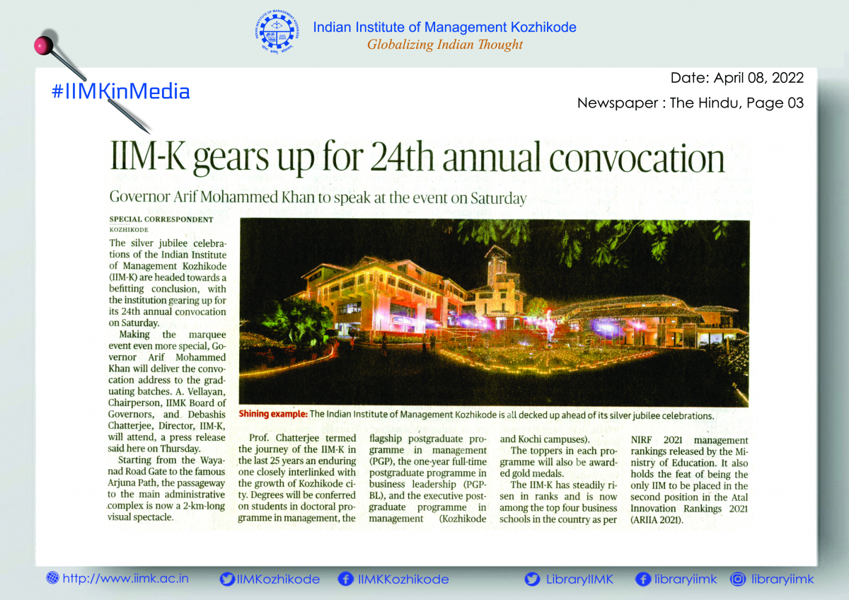 The Silver jubilee celebrations of Indian Institute of Management, Kozhikode(IIM-K) will conclude with 24th annual convocation scheduled on April 9.