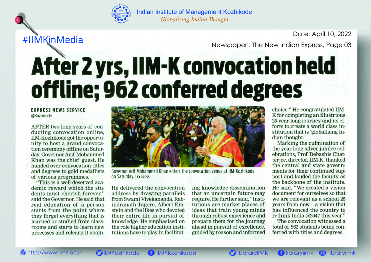 Making the marquee event even more special, Governor Arif Mohammed Khan will deliver the convocation address to the graduating batches. A. Vellayan, Chairperson, IIMK Board of Governors, and Debashis Chatterjee, Director, IIM-K, will also be present.
