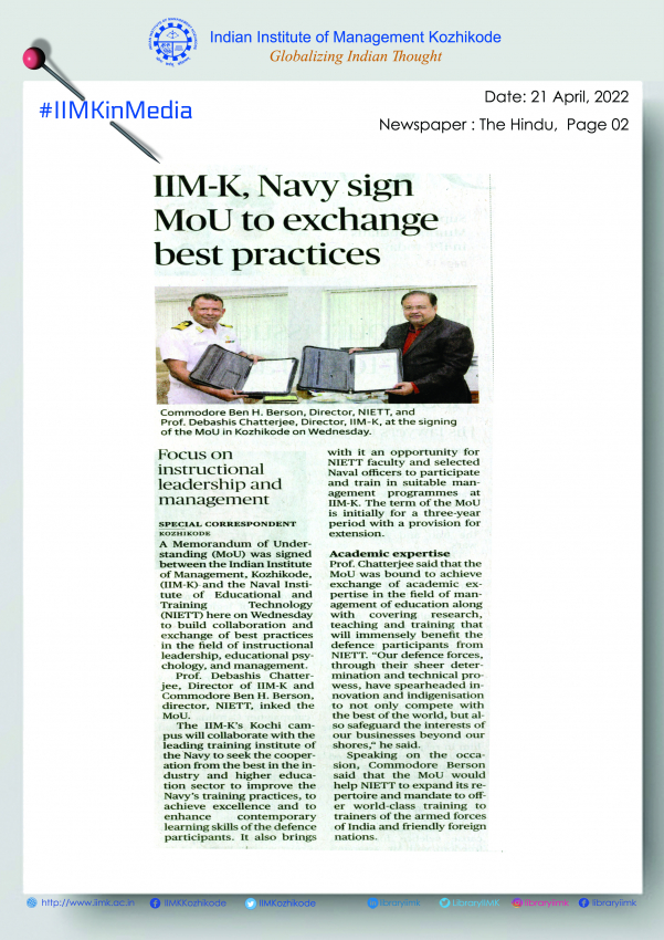 The IIM-K’s Kochi campus will collaborate with the leading training institute of the Navy to seek the cooperation from the best in the industry and higher education sector to improve the Navy’s training practices, to achieve excellence and to enhance contemporary learning skills of the defence participants. It also brings with it an opportunity for NIETT faculty and selected Naval officers to participate and train in suitable management programmes at IIM-K. The term of the MoU is initially for a three-year period with a provision for extension.