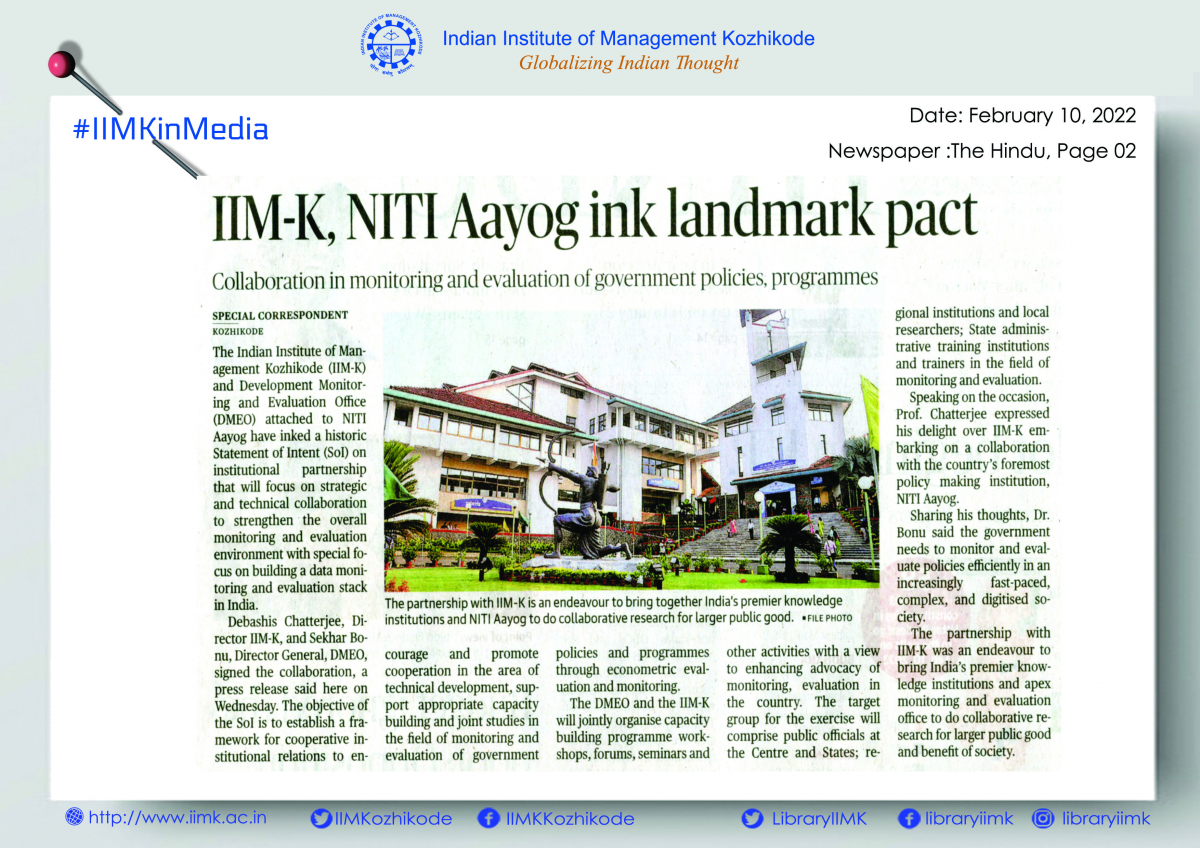 IIM- Kozhikode and NITI Aayog come together to boost monitoring and evaluation ecosystem in India; Ink landmark Sol