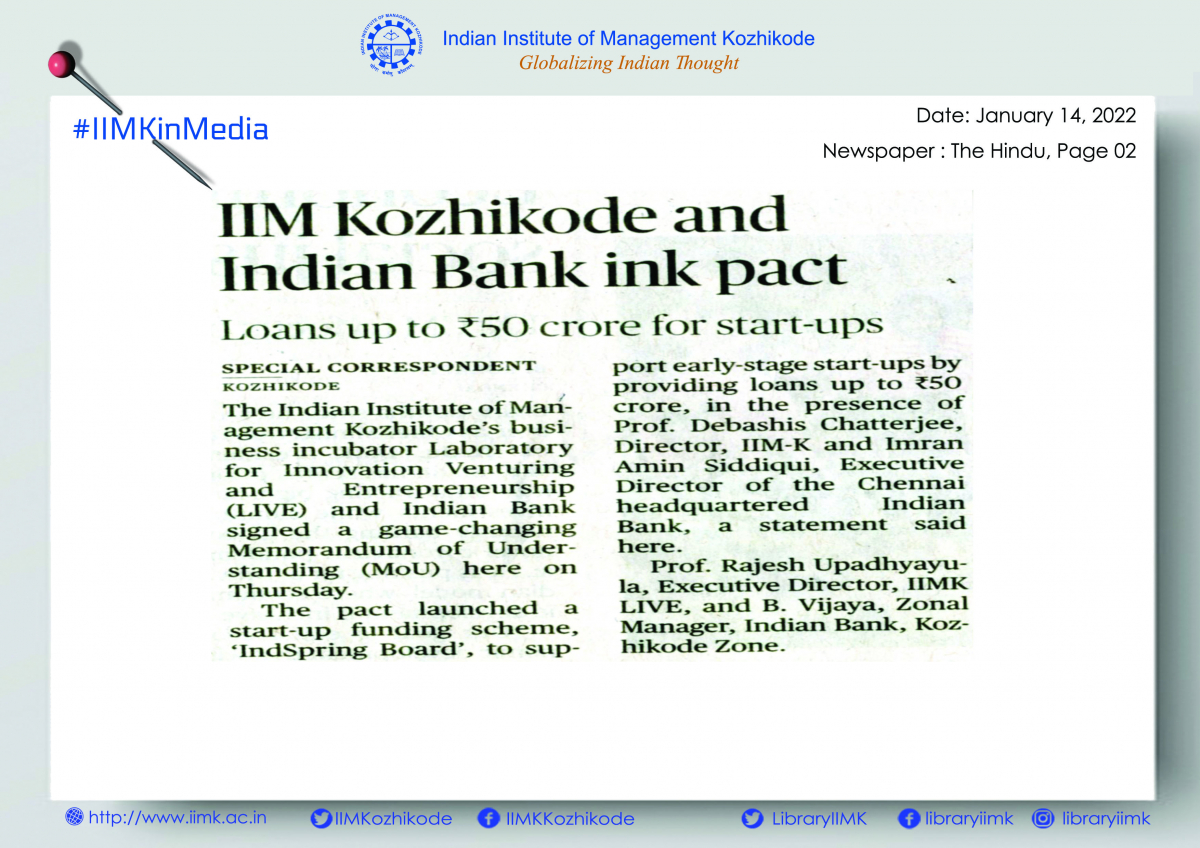 IIM Kozhikode's business incubator LIVE and Indian Bank signed a game-changing MoU here on Thursday.