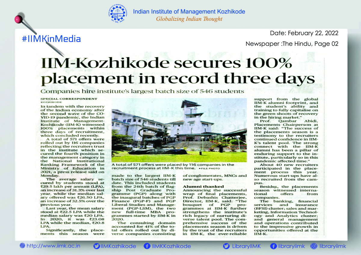 IIM-Kozhikode witnessed 100% placements within three days of recruitment, which concluded recently. Companies hire institute's largest batch size of 546 students.