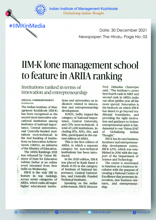 The Indian Institute of Management Kozhikode (IIM-K) has been recognised as the second most innovative educational institution among institutes of national importance, Central universities, and Centrally-funded institutions (non-technical) in the Atal Ranking of Institutions on Innovation Achievements (ARIIA), an initiative of the Ministry of Education.