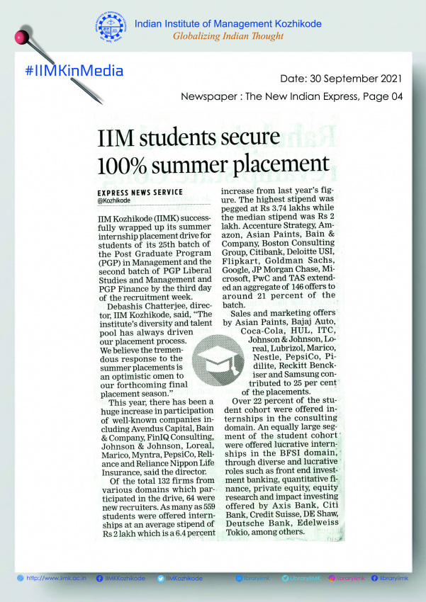 IIM Kozhikode First off the Block; Wraps Up and Secures 100% Summer Placements on Third Day of Process for Silver Jubilee Batch