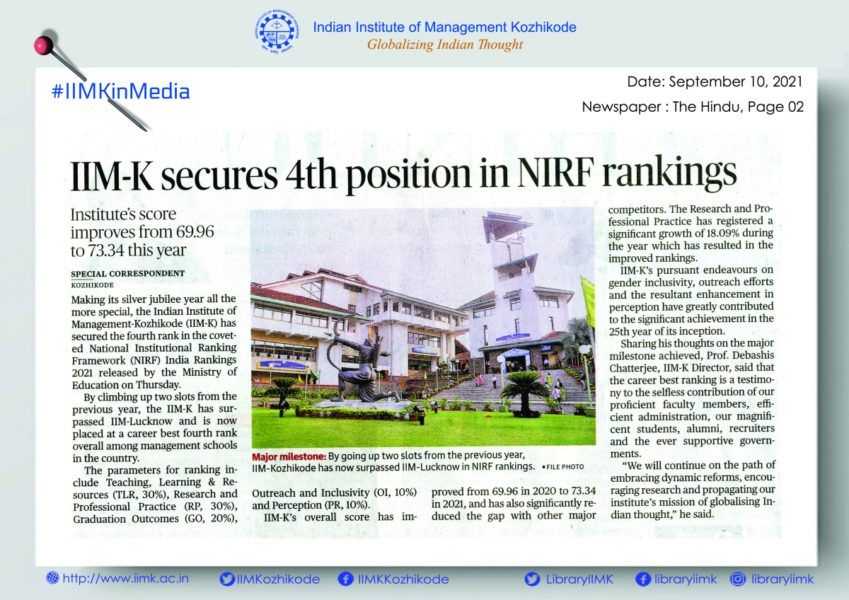 IIM Kozhikode Climbs Two Spots to Attain Career Best Rank 4 in NIRF 2021 Management Rankings