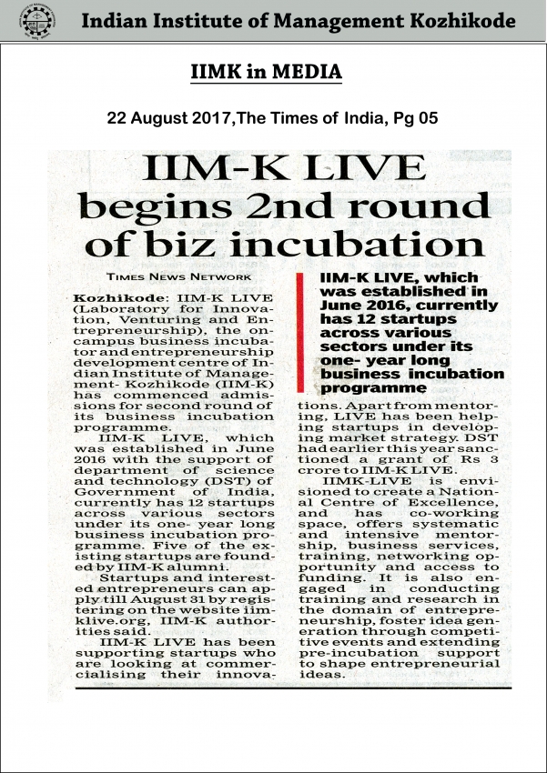 IIM-K LIVE begins 2nd round of biz incubation